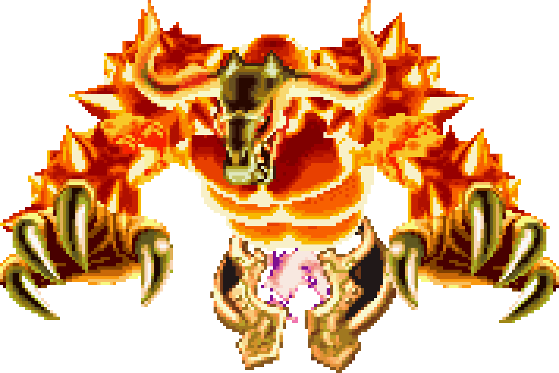 Aguni is an impressive looking demon that resembles the giant skeletal torso of a bull-like humanoid hybrid creature clad in spiked armor, with large clawed hands, and engulfed in flames. He mainly stays near the top of the screen and hovers from side to side. His main form of attack consists in unleashing a variety of fiery attacks.