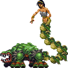 The Amphisbaena is portrayed as a stout-bodied reptile covered with both scales and hair. Its secondary head is in the guise of a maiden from head to hips who is attached to the main body via a long, upright tail. This feature seems to be unique to Castlevania and forms the basis of the creature's offensive options, consisting primarily of fireballs (spewed only by the maiden's head). The player is able to stand on the reptile portion of the body without being harmed. Attacking the maiden will cause her to flinch back but she won't take any damage.