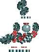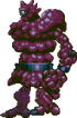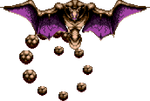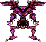 The fiend boasts bat-like wings and a ghastly mouth filled with pointy sharp teeth emerges from his gut, from which he launches swirling fangs that will explode into a column of flames on contact. He also makes long swoops across the screen. Each time he's struck, his very being gets a bit distorted in this unstable environment, turning into a devilish red tone the more damage he sustains and acquiring new offensive abilities along with his body's degradation. In this form, he will often hover on one side of the screen and unleash a long stream of flames that will travel across the floor in an elliptical manner.