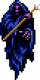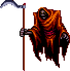Once all cards of fate have been turned, Death will properly enter the battlefield and the main boss fight will commence. He hovers high in the air while summoning little sickles that are launched down at the hero's location at great speed. He will then proceed to descend to ground level and make a fast swoop across the room while swiping with his scythe. And lastly, he will perform a variant of an attack first seen in Super Castlevania IV where he remains on one edge of the screen and sends his scythe swirling forth in a boomerang-like manner while unearthly winds pull the hero toward him. As the last strike is unleashed on Death, he writhes in agony while infernal blue flames consume him and take him away from this plane of existence.