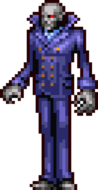 Brauner was like most vampires, an abnormally tall humanoid with ghostly pale skin, crimson red eyes and long purple nails. Similarly to Olrox, Brauner was also bald. He donned a set of refined clothing consisting of a thick buttoned coat with long wide sleeves, featuring white sections with an intricate black pattern. He also dons a pair long purple pants and a pair of classic shoes. Interestingly, Brauner is seen with a golden cane with a skull design. During his appearances, Brauner is never seen walking and mostly relies on his paintings for transportation. This might suggest a potential disability, although he can use his legs in battle.