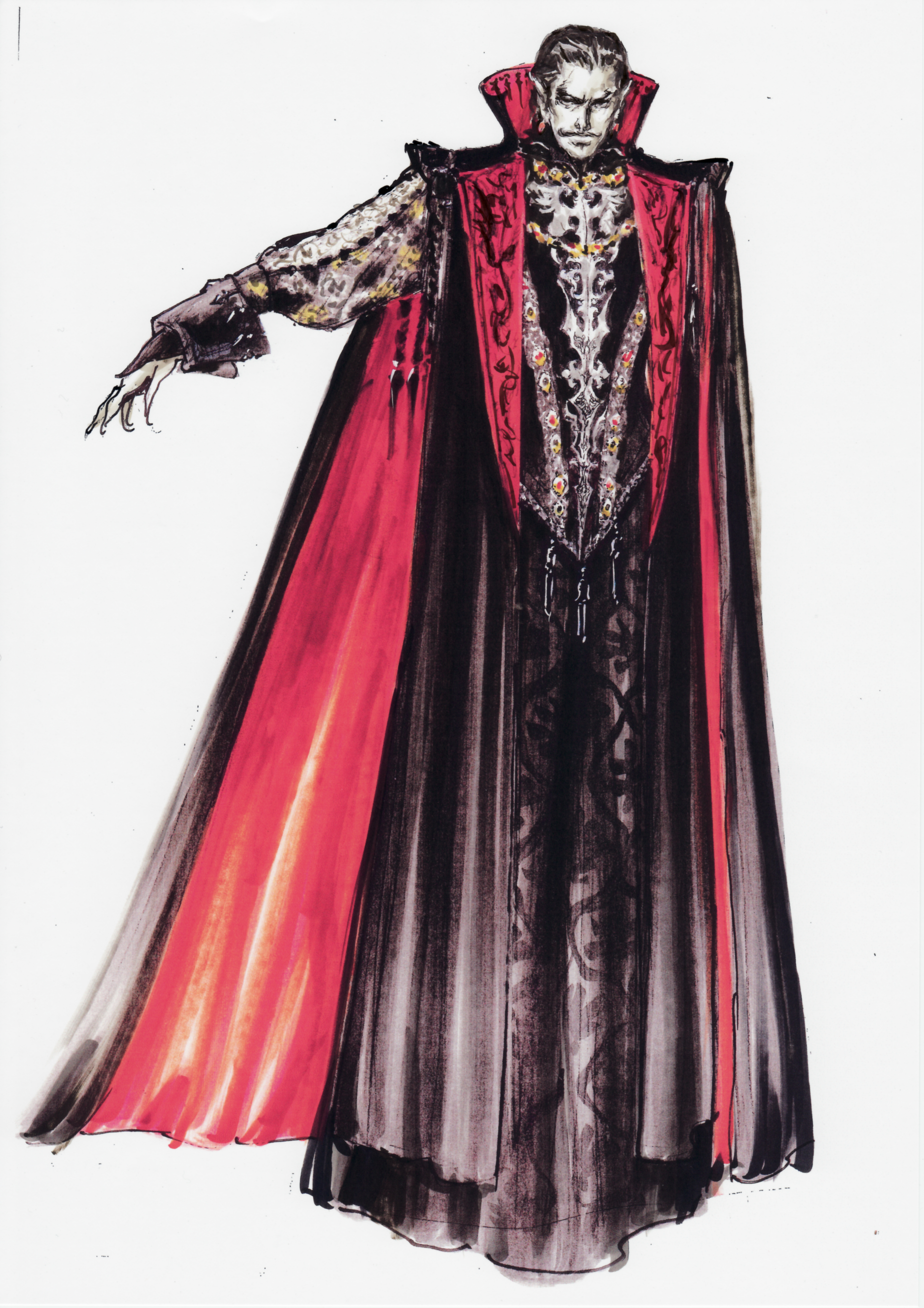 Sometimes Dracula sports a dark sorcerer like appearance with long flowing robes as seen in Dracula's Curse and The Adventure. In Rondo of Blood, Dracula appears as a young man with purple hair. Aside from displaying certain Japanese anime clichés, he still wears attire like he did in earlier games, like a tuxedo and a long dark cloak.