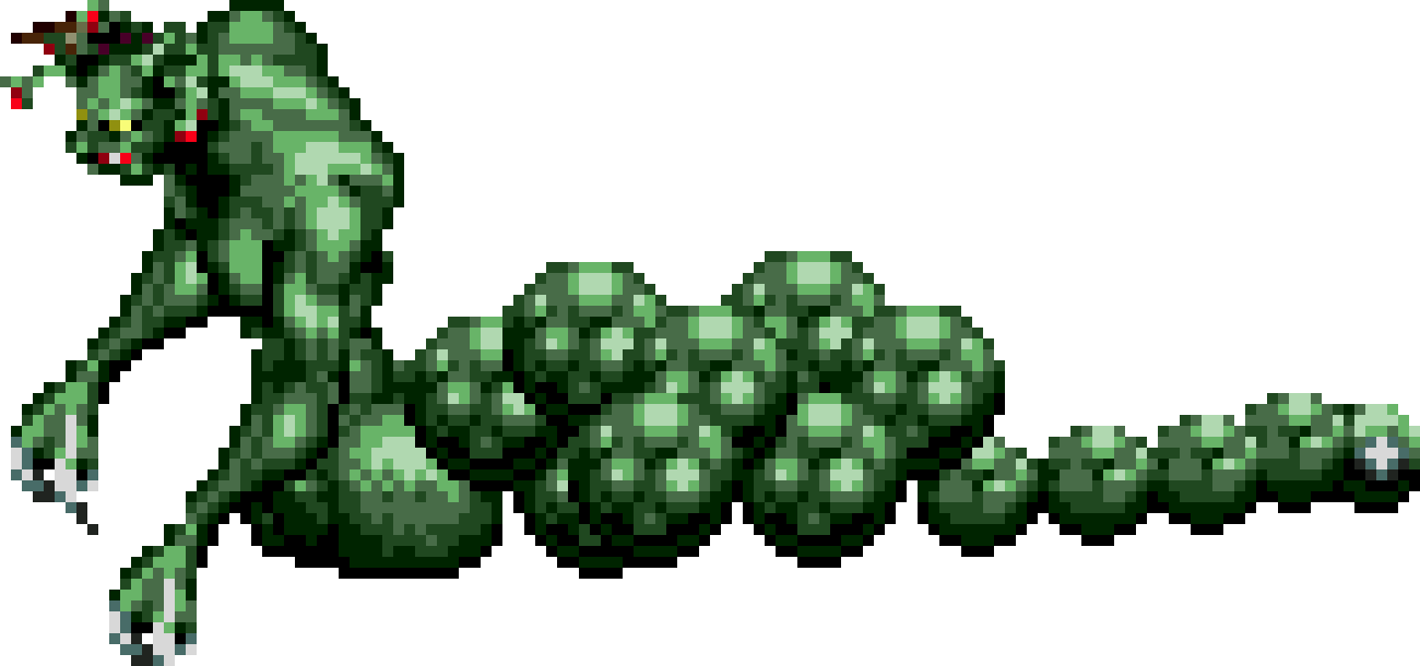 Medusa attacks by spewing two fireballs that undulate across the screen, one high and one low; the player must position himself among the safe spots left by their trajectories. She will also breathe a stream of flames upward that will then descend near the ground; crouch to avoid taking damage. Next, she'll slither her serpentine tail and lash it in a whip-like manner all across the floor; perform a well-timed jump in order to avoid it. Between all of her main attacks, she'll slowly move forward, performing short lunges while swiping with her claws.