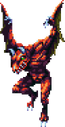 He attacks by flying through the air, intermittently spewing fireballs down at the player. In Super Castlevania IV, he can also land and knock stalactites down from the ceiling. After sustaining enough damage, he turns red and begins firing bigger and more powerful blasts of fire, as well as moving in different patterns.