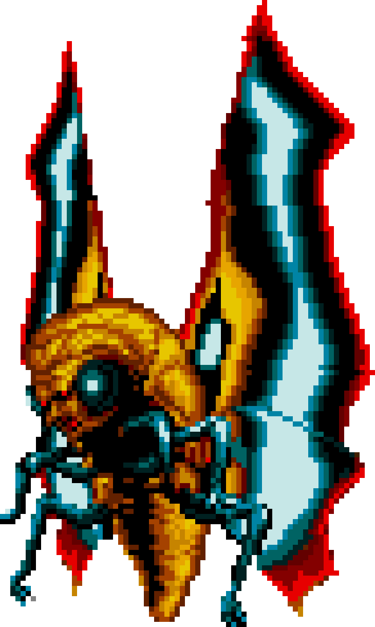 After sustaining enough damage, the Princess will drop to the ground and reveal a much less pleasant form: a gigantic moth that rips out from her back. The insect itself is the real identity of this fiend, with the human skin being just a veil to conceal its monstrous nature. Once transformed, the monster becomes more mobile and tends to fly out of the reach of most attacks.