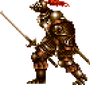 The knight attacks by throwing his battle axe at the player, which will return back to his hand in a boomerang-like manner, and also by smashing it on the ground, generating two flames that will traverse across the floor, one on each direction. When three fourths of his life bar have been depleted, his battle axe will break apart and he'll then draw out his sword to continue the battle.