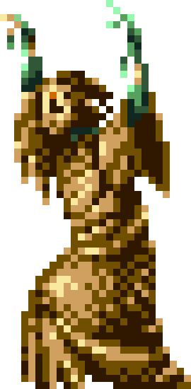 | Japanese Description: (*) A monster whose hair is made of snakes and half of whose body is covered in scales, resembling a snake. |