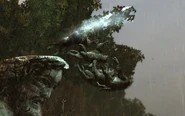 The Great Warg has few attacks: it swipes its claw and do a charging bite, glowing briefly when it's about to do this; the swipe can be blocked but the charge should be dodged. It loses health fairly quickly, though. It is killed by impaling it with a large wooden stake from the broken gate in a short interactive sequence.