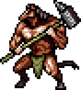 A modified sprite of the Minotaur. The Were-Horse is a large and muscular monster with the head of a horse. It is covered in light brown fur, has a crest of dark brown fluff sitting atop its neck, and wears a small loincloth around its waist. It comes armed with a big warhammer and advances slowly toward the player; once the latter is at a considerable proximity, the monster quickly lunges forward while swinging its weapon, smashing it on the ground and producing damaging debris that break out from the impact. Keeping a safe distance and using ranged attacks (such as throwing Crucifixes at it) is a good way to deal with it.